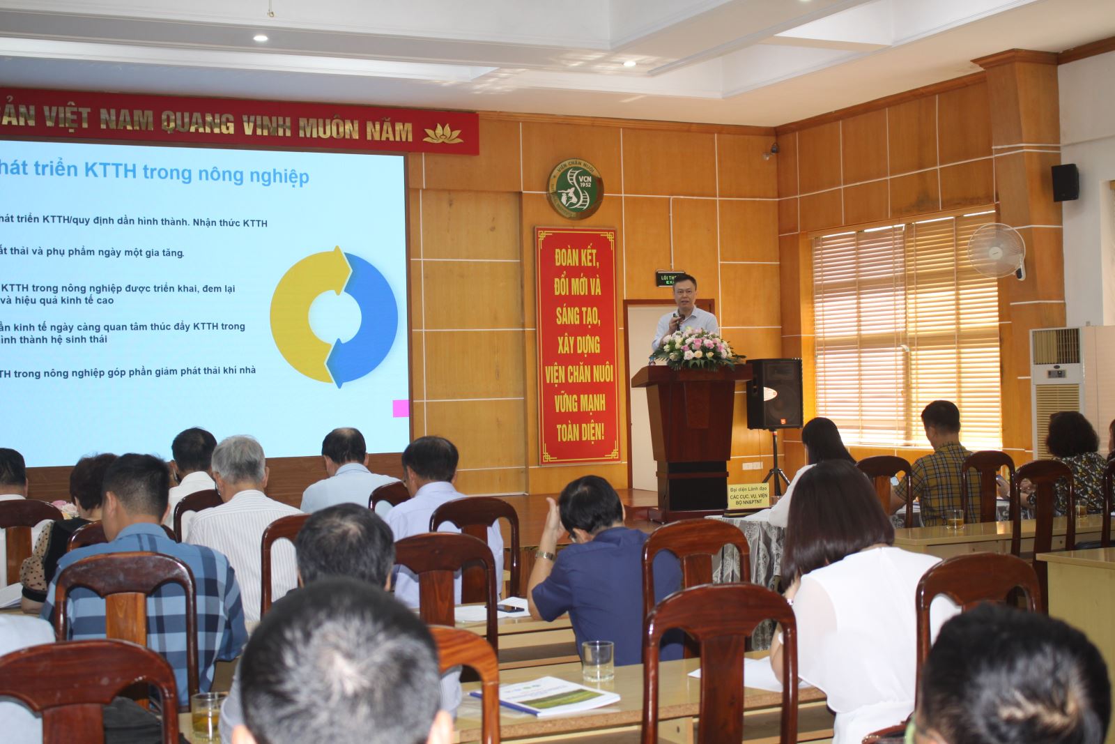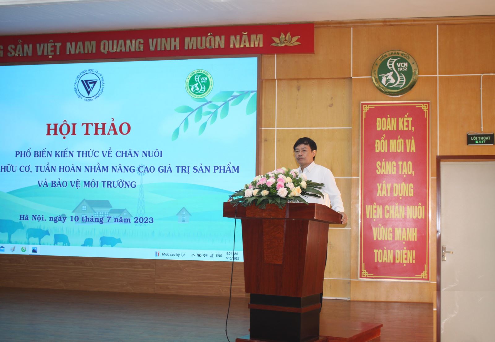 Sáng 10/7/2023, Viện Chăn nuôi phối hợp với Hội Chăn nuôi Việt Nam tổ chức Hội thảo “Chăn nuôi theo hướng hữu cơ, tuần hoàn nhằm nâng cao giá trị sản phẩm và bảo vệ môi trường” tại hội trường lớn của Viện Chăn nuôi, số 9 Tân Phong, P. Thụy Phương, Q.Bắc Từ Liêm, Hà Nội, do TS. Nguyễn Xuân Dương – Hội Chăn nuôi Việt Nam; TS. Phạm Công Thiếu – Viện trưởng Viện Chăn nuôi; PGS.TS. Lê Thị Thúy – Hội Chăn nuôi Việt Nam chủ trì.